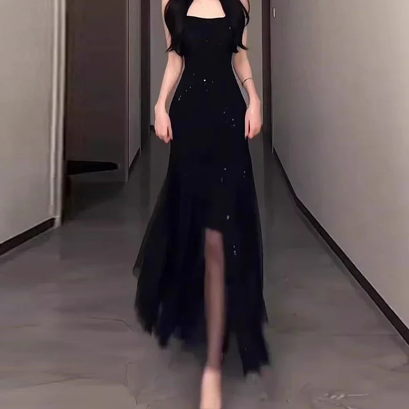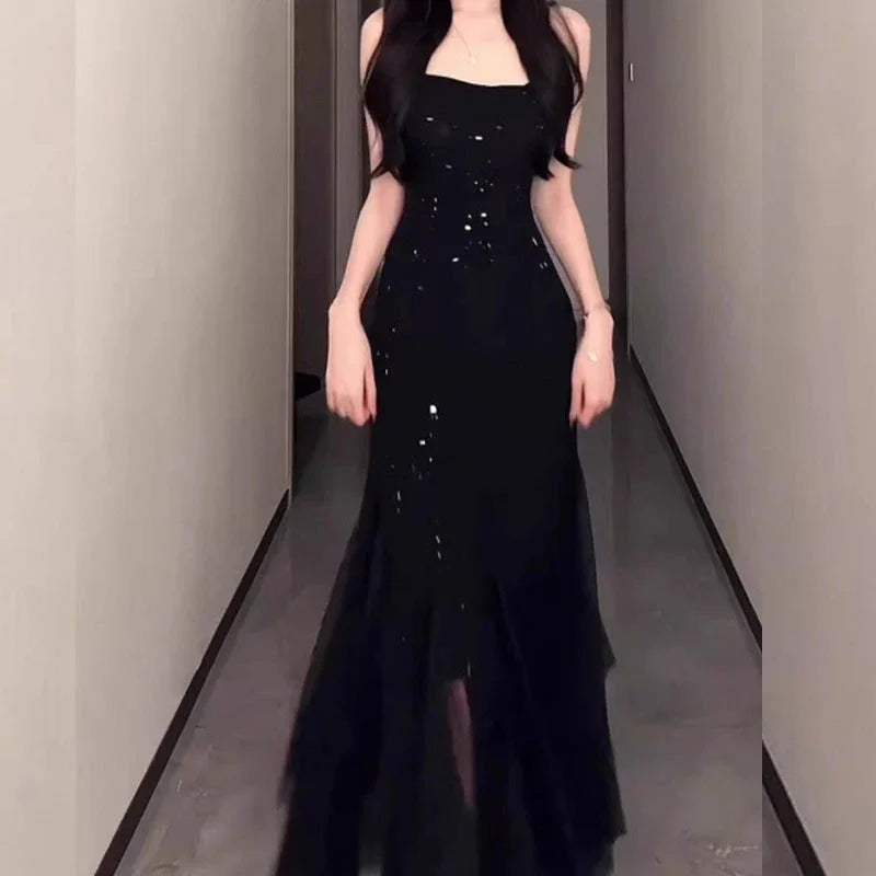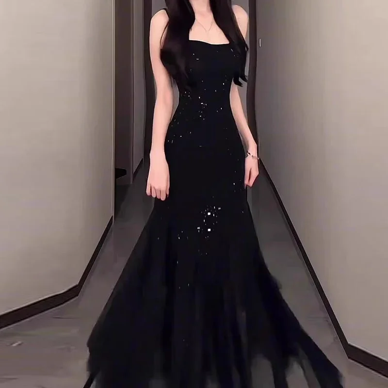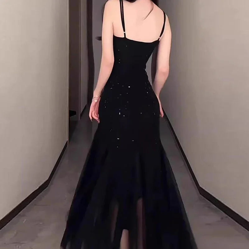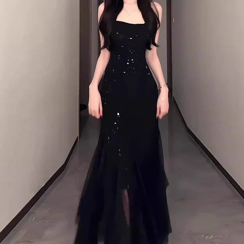 2025 New Black Sequined Long Dress Spring Summer Women Princess Banquet Party Dress Performance Suspenders Mesh Prom Dresses