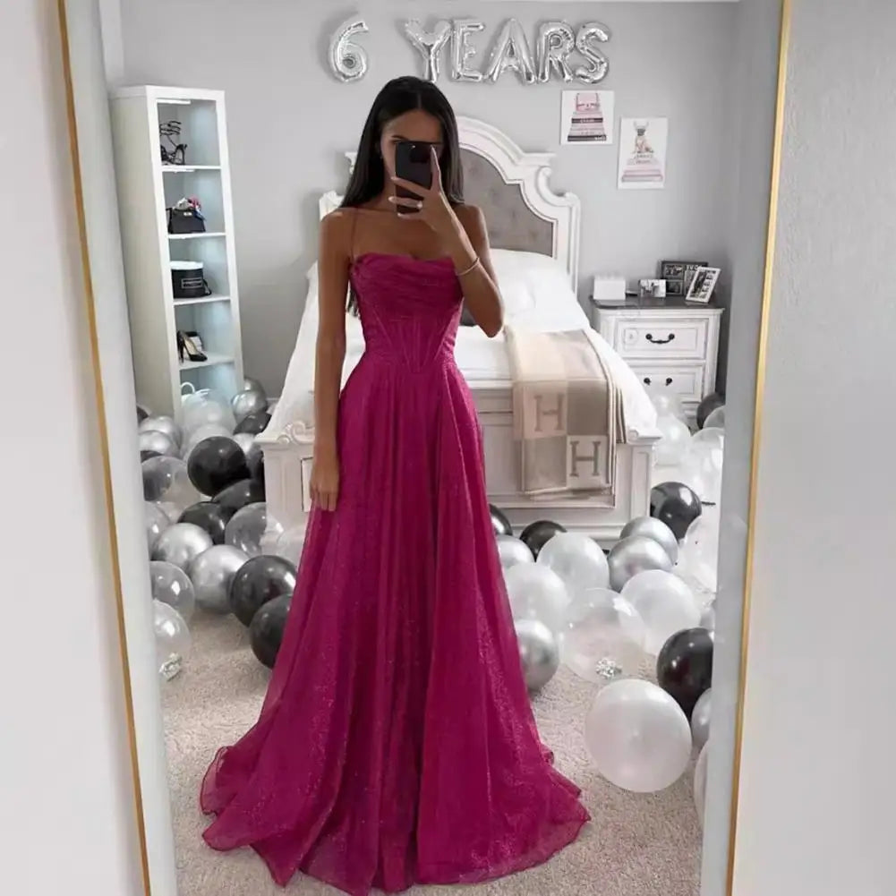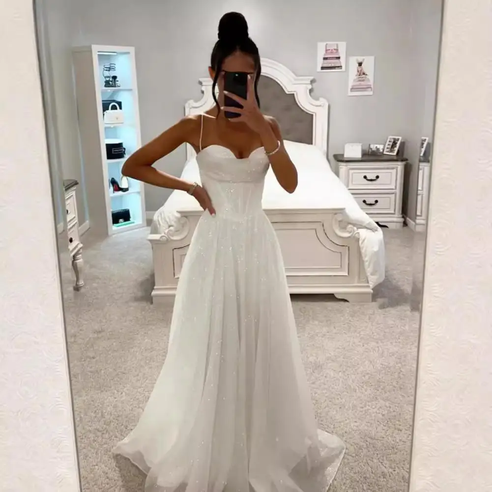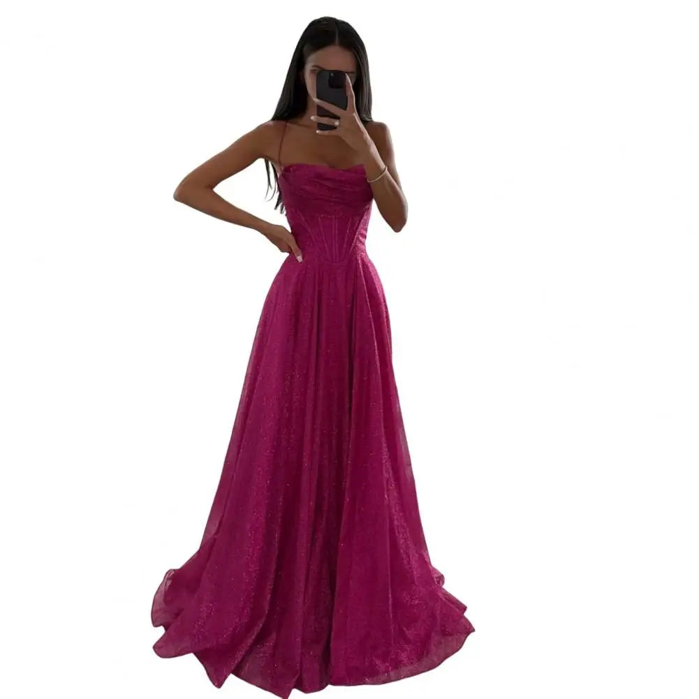 Bridal Wedding Dress Prom Party Evening Dress Backless Spaghetti Strap Sequin Sleeveless A-line Floor Length Ball Gown Pleated Low-cut Cocktail Dress