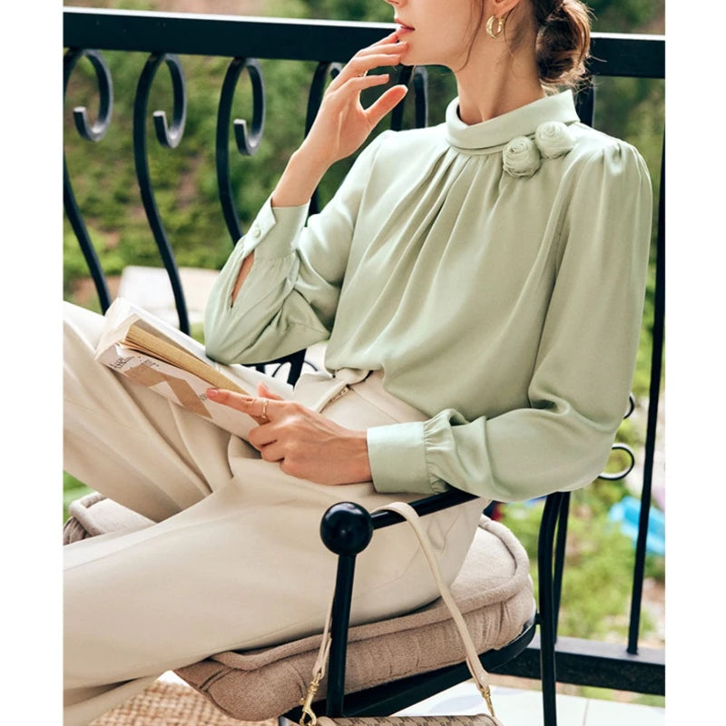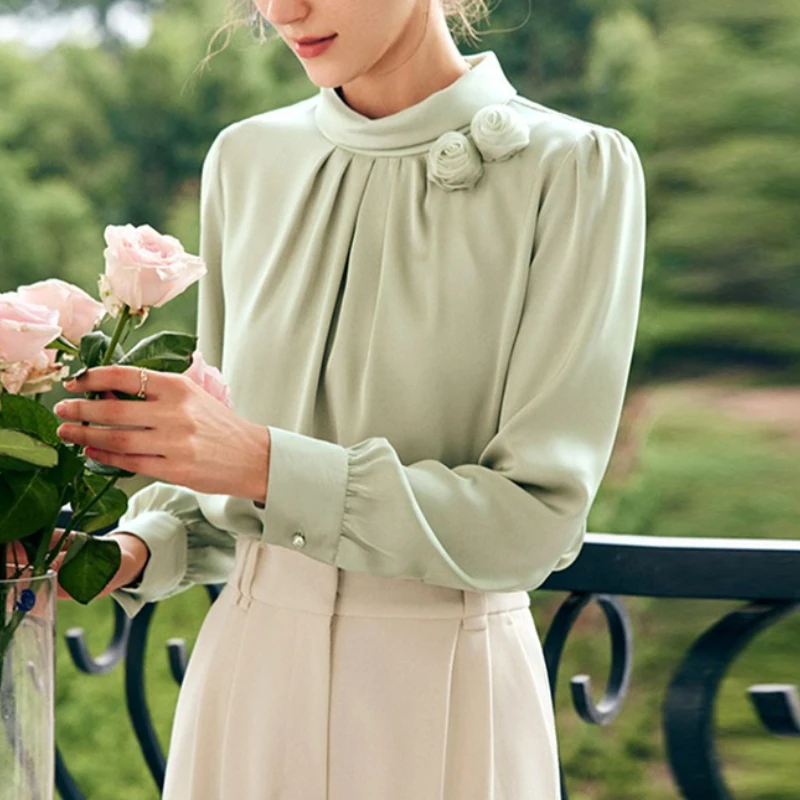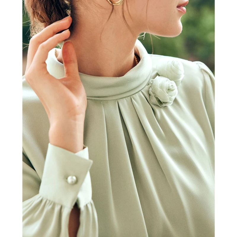 Spring Autumn Elegant Satin Flower Women's Blouse 2025 New Long Sleeve Stand Collar Korean Casual Loose Office Lady Shirt Female
