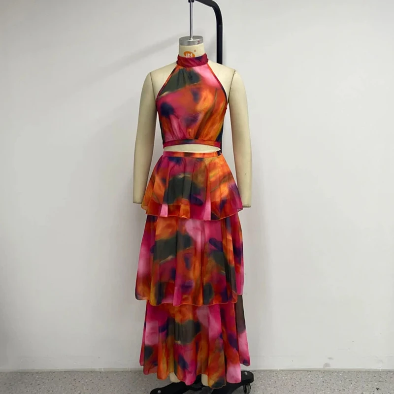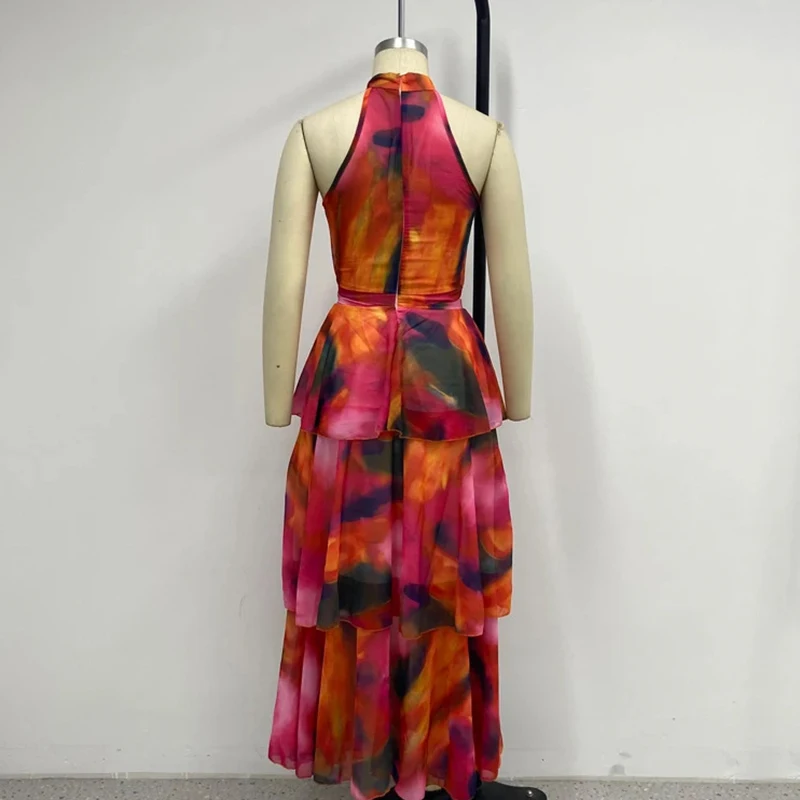 Summer Sleeveless Temperament Slim Dress Elegant Women Pattern Print Outfits New Sleeveless Halter High Waist Cake Party Dress