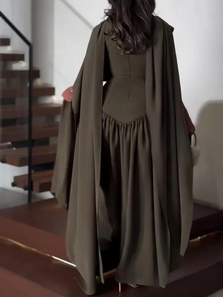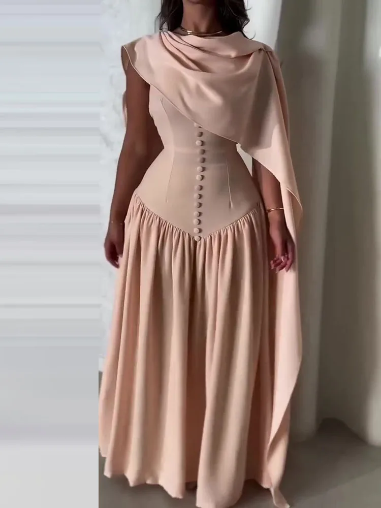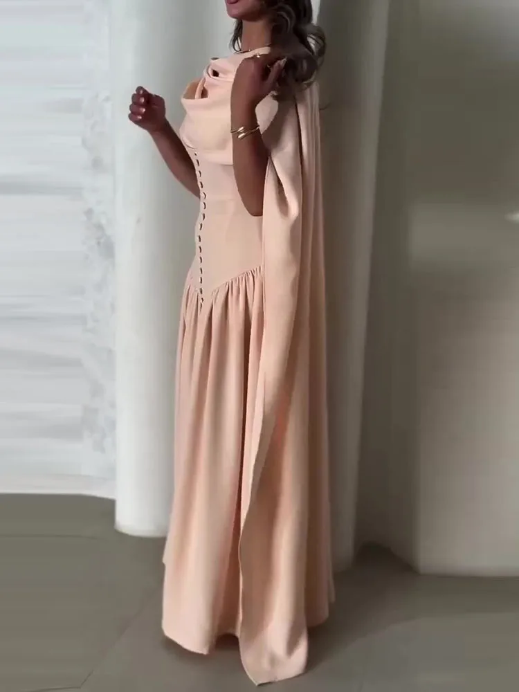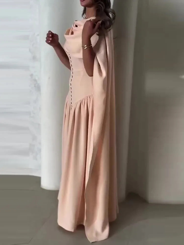 Temperament Design Style Pure Color Evening Dress Summer New Elegant Lady Party Dress Chic Shawl Sleeve High Waist Pleated Dress