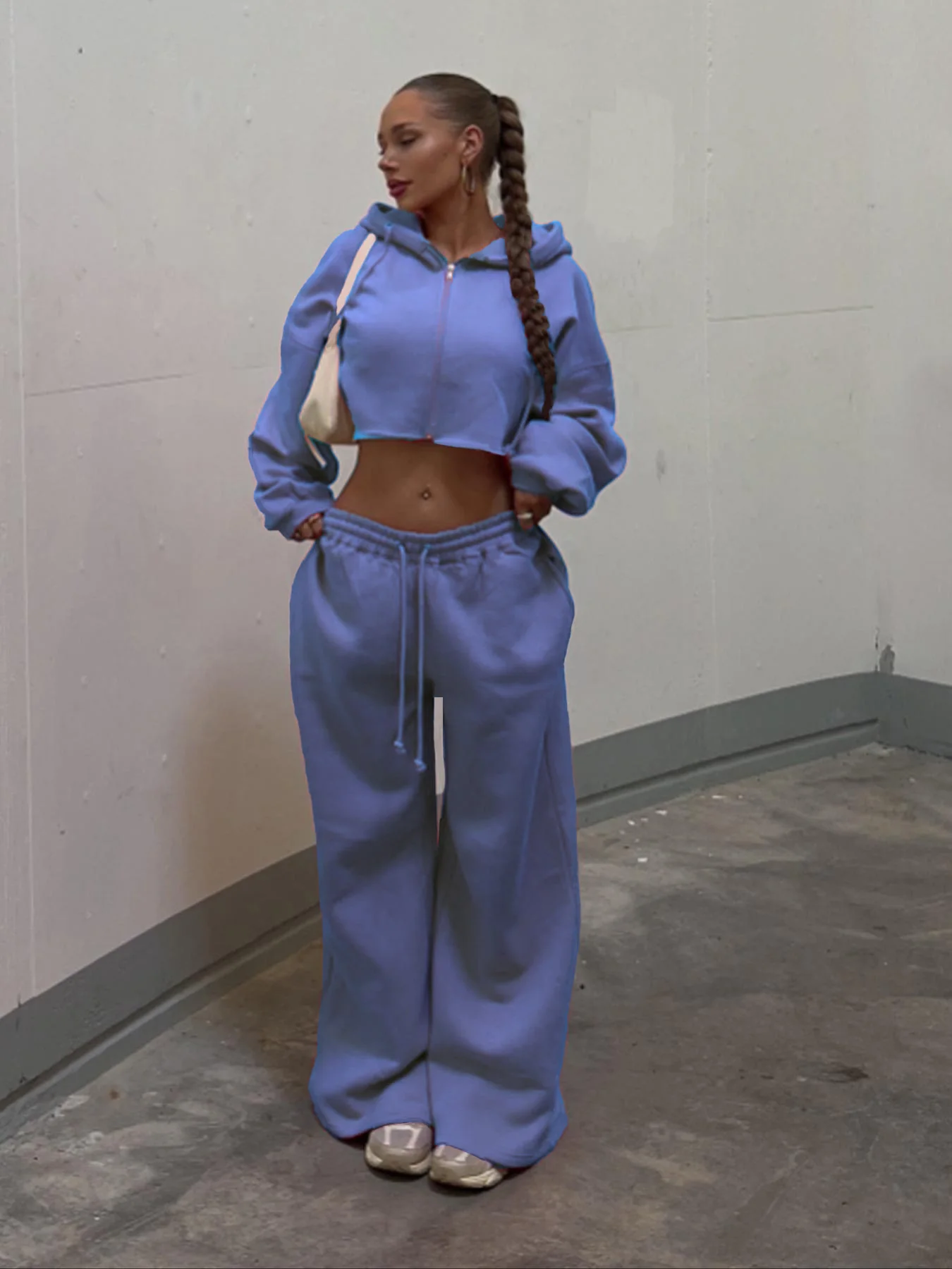 Featuring a solid color with a zip-up hoodie and drawstring waist sweatpants, this set exudes a casual yet stylish vibe.